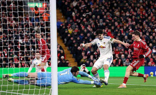 2天后要奔赴伦敦连战富勒姆和阿森纳,面对客场防守稀松的利兹联(此前客场比赛全部有丢球),斯洛特继续将小伤在身的维尔茨放在了前场偏左的位置,毕竟上轮对垒狼队,德国人就在这个角色上干得不错。开场阶段,维尔茨和埃基蒂克的呼应也的确不少,法国前锋首次射正被卢卡斯·佩里扑出后,第二次内切选择找到小禁区边缘的维尔茨,但后者跟进推射被封堵。眼见客队三中卫守得腹地密不透风,利物浦由琼斯等人逐渐增加外围发炮,孰料本方禁区却险些被偷袭得手。阿利松几乎没有难度的出球直接送到安帕杜脚下,好在后者也没做足射门准备,抡了一脚也是回传力度。